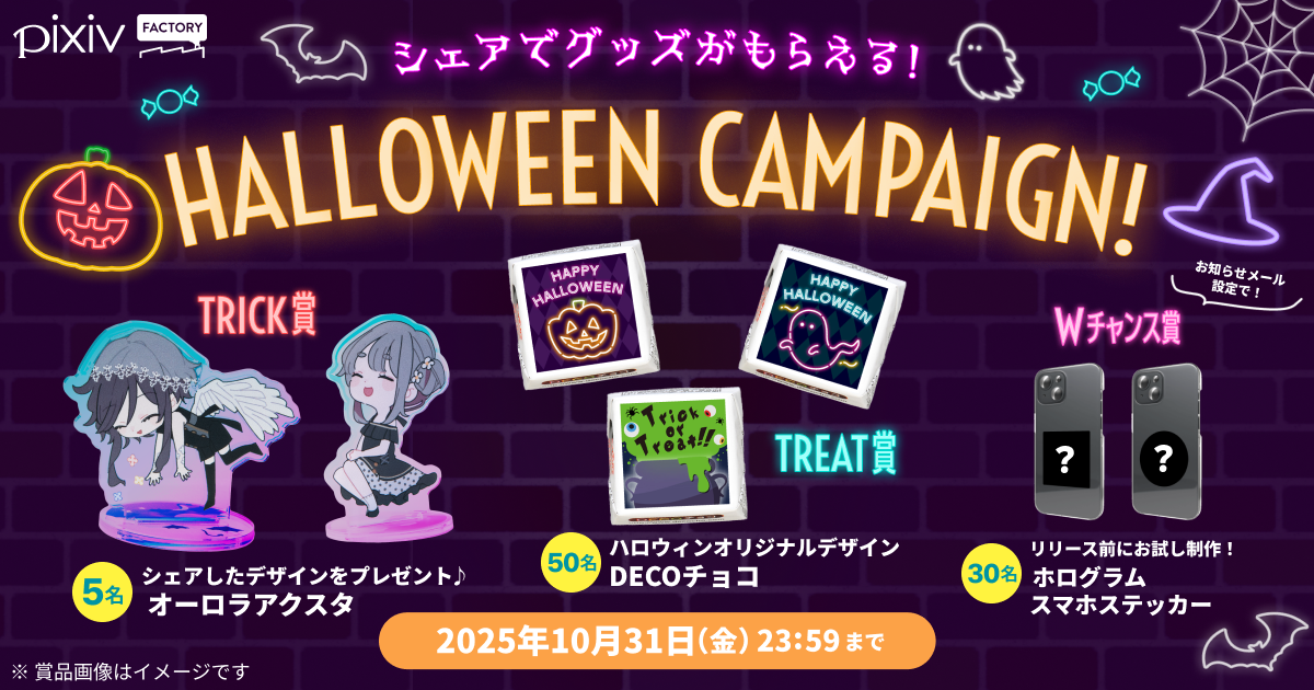 2025年10月9日(木)15:00から、グッズのプレビューをシェアした方に抽選でオーロラアクスタやDECOチョコが当たる「シェアでグッズがもらえる! ハロウィンキャンペーン」を開催します。