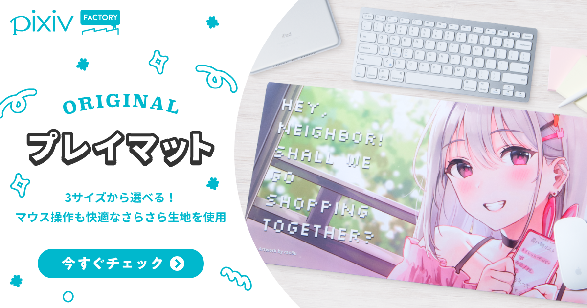 pixivFACTORYで「プレイマット」がつくれるようになりました。 ・3サイズからお選びいただけます。 ・表面はマウス操作が快適なさらさらとした生地、裏面はズレにくいラバー素材を使用しています。 ・在庫を抱えず販売できるBOOTHオンデマンド販売にも対応しています。 ▼「プレイマット」の詳細はこちら https://factory.pixiv.net/products/playmat 今後ともpixivFACTORYをよろしくお願いいたします。