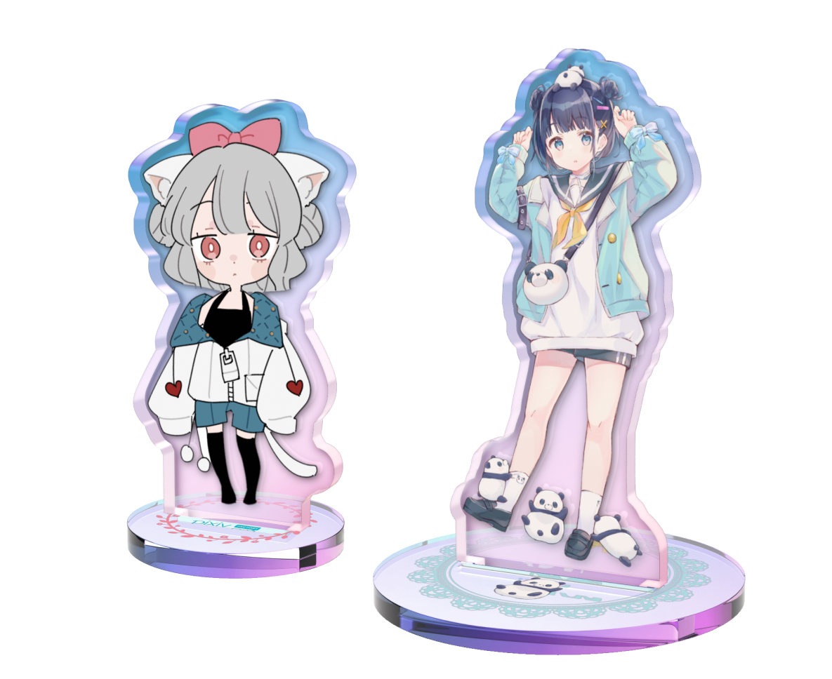 大人気のアクリルフィギュアスタンド(アクスタ)に、見る角度によって虹色に輝くオーロラ加工が登場! 光の当たり方で表情を変える幻想的なきらめきが、あなたのイラストや写真をより一層引き立てます。オリジナルのオーロラアクスタが1個から制作できるため、推しを特別な輝きで飾りたい方や、イベントの注目商品にぴったりです。台座部分にも印刷ができるため、キャラクターの名前やロゴを入れれば、さらに統一感のある仕上がりに。いつもとは一味違う、特別な存在感を放つ自作アクスタをつくってみませんか?