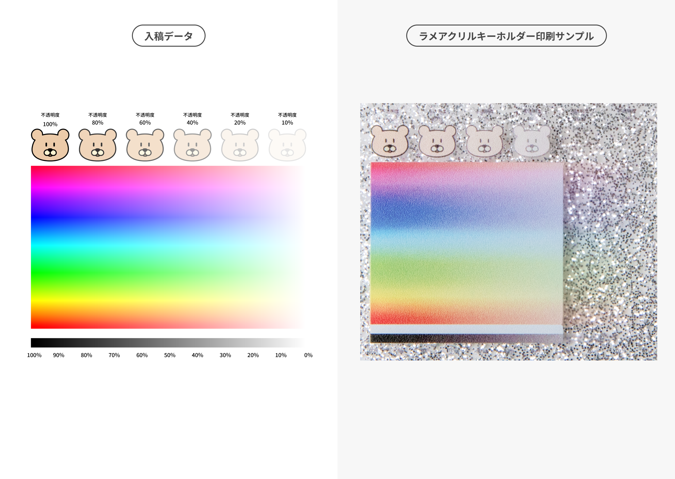 イラストの上にアクリルを重ねるため、仕上がりは画面上や紙の印刷物より薄く見えます。
